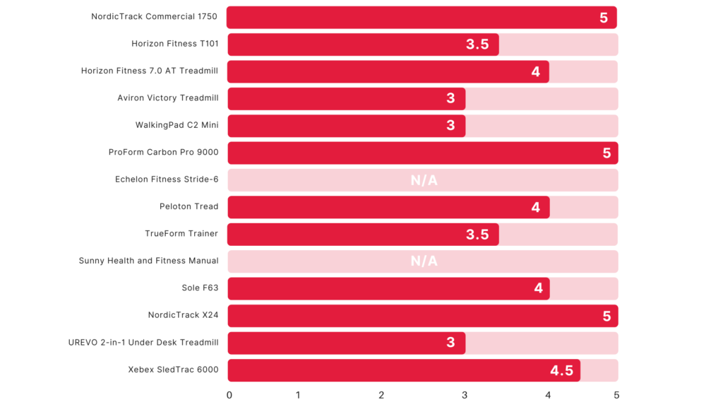- Programming: Treadmills that receive a 4 out of 5 or higher offer preset programs and are compatible with streaming apps that feature libraries of on-demand workouts.